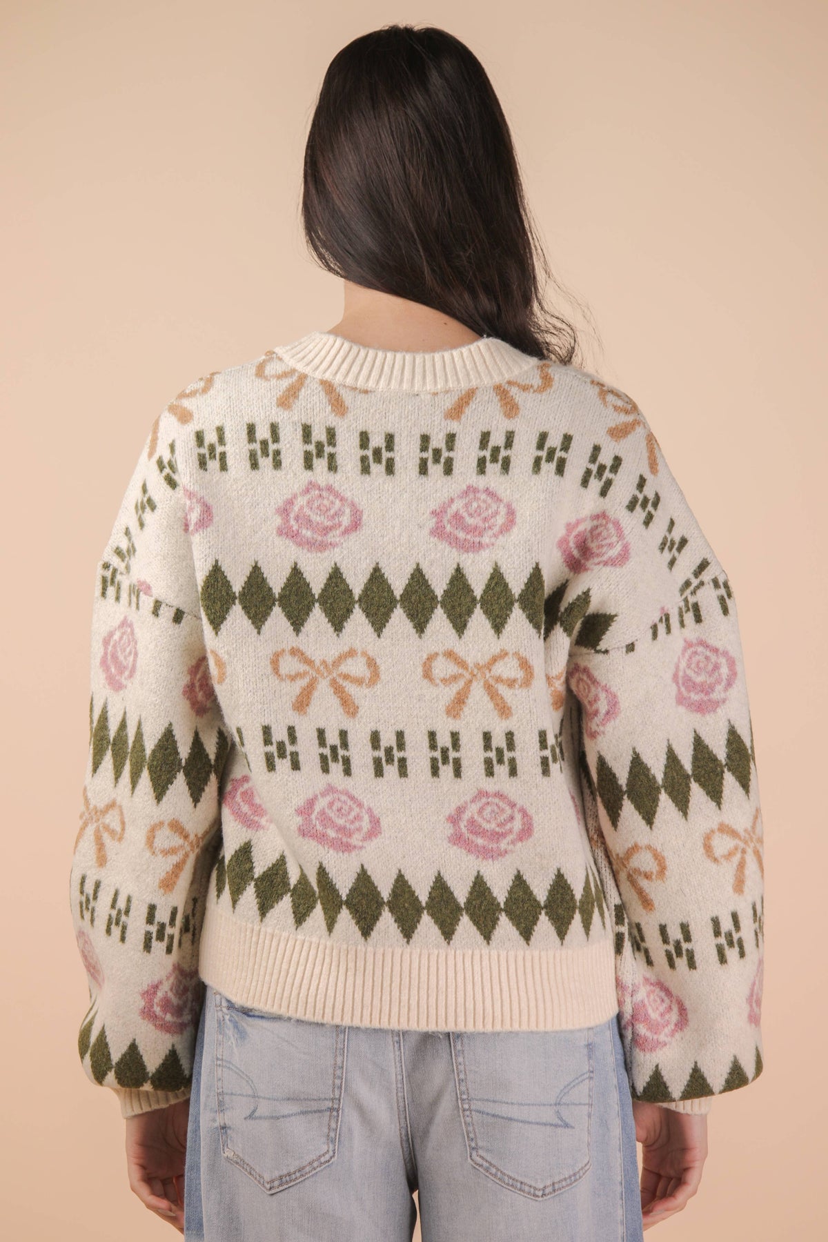 Embrace cozy charm with this oversized knit cardigan, featuring a delightful bow and floral graphic that brings personality to any outfit. The button-down design makes layering effortless, while drop shoulders create a relaxed, modern silhouette. Long sleeves and ribbed hem provide a polished finish that keeps everything in place. Perfect for casual days when you want comfort without sacrificing style.